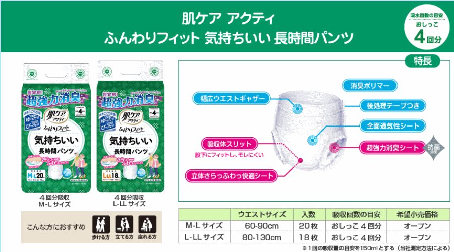 ●「消臭ポリマー」 ●「全面通気性」 ※後処理テープ付 商品名 肌ケアアクティ ふんわりフィット気持ちいい長時間パンツ タイプ パンツタイプ 吸水量 吸収量600cc(おしっこ約4回分) サイズ・袋入り数 M-L:(ウエストサイズ)60-90cm 20枚入り L-LL:(ウエストサイズ)80-130cm 18枚入り >>ケース販売(4袋入り)はこちら 注意事項 ※画面上と実物では多少色具合が異なって見える場合もございます ※複数店で在庫を共有しているためご注文のタイミングで在庫を確保できない場合がございます。