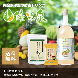 ※ご注文の際には「味指定」「計量カップ必要個数」を必ずご選択ください。 ※代引でのご注文を頂いた場合、商品到着予定日から6日以内にお受取を頂けない際にはご返送・キャンセルとなってしまう場合がございます。どうぞご了承のほどをお願い致します。 商品名 優光泉酵素 名称 植物性発酵飲料(清涼飲料水) 原材料名 ※カッコ内は材料の産地です。大根(福岡・熊本・北海道)・キャベツ(福岡・熊本)・ニンジン(福岡・熊本・長崎)・トマト(福岡・大分・熊本)・きゅうり(福岡・熊本)・じゃがいも(福岡・熊本・長崎)・さつまいも(福岡・鹿児島・熊本)・パイナップル(沖縄)・里芋(福岡)・かぼちゃ(福岡)・れんこん(佐賀)・ごぼう(福岡)・昆布(北海道)・レモン(和歌山・小豆島)・リンゴ(福岡・青森)・山芋(福岡)・生姜(福岡・高知)・パパイヤ(宮崎・沖縄)・スイカ(福岡・熊本・大分)・メロン(福岡)・あんず(福岡)・もも(福岡)・いちじく(福岡)・キダチアロエ(福岡)・スギナ(福岡)・ヨモギ(福岡)・菜の花(福岡)・あけび(福岡)・かりん(福岡)・イチゴ(福岡)・しいたけ(福岡・大分)・まくわうり(福岡)・とうがん(福岡)・せり(福岡)・みつば(福岡)・もやし(福岡)・クマザサ(福岡)・ぶどう(福岡)・ぐみ(福岡)・キュウイ(福岡)・梅(和歌山)・びわ(福岡)・きんかん(福岡・鹿児島)・つわぶき(福岡)・柿の葉(福岡)・しそ葉(福岡)・米(福岡)・大豆(福岡・北海道)・小豆(福岡)・はとむぎ(福岡)・粟(福岡)・キビ(福岡・北海道)・松葉(福岡)・杉葉(福岡)・桧葉(福岡)・松樹液(福岡)・杉樹液(福岡)・桧樹液(福岡)・すもも(福岡)・わかめ(福岡) 内容量 1200ml 保存方法 直射日光を避け冷暗所に保存して下さい 熱量(100mlあたり) 178kcal 栄養成分表示 (100gあたり) たんぱく質・・・0.25g 脂質・・・0.21g 炭水化物・・・56.91g ナトリウム・・・8.7mg お召し上がり方 ・自然のものでつくられていますのでお子様からお年寄りの方まで、安心してお飲みいただけます。 ・このままか、お好みに合わせてうすめてお飲み下さい。ただし70度以上の熱いものと混ぜるのはお避け下さい。 製造販売元 20年におよぶ断食道場での指導ノウハウで在宅断食を実現した 「エリカ健康道場」(佐賀県佐賀市)が、特別に依頼して作成したエリカ健康道場オリジナル野菜酵素飲料「優光泉酵素」です。 商品区分 清涼飲料水 日本製 広告文責 エリカ健康道場 0952-31-1394ファスティングに入る前に、体を整えておきましょう。 食事は、油ものや肉などを極力避けるようにして、和食中心の食材を摂取するようにします。 体内に溜まっている脂肪を燃焼させ、有害物質を排泄するために、ビタミン・ミネラルをしっかり蓄えます。 この期間をとらずにファスティングに入っても問題はありませんが、準備したほうが、ファスティングの効果を十分に発揮させることができるといえます。 いつでも飲めるように原液60?80mlを水で薄めて、500mlのペットボトルにいれ、持ち歩きます。ペットボトル1本でだいたい1日持ちますから、これ1本あれば、忙しくて食べれなかった時でも、全然平気だと思います。 酵素だけを飲んでほかの食事をとりません。 優光泉酵素は20mlをお好みの味(4?5倍)に薄めて9回以上お飲みください。 どんなに飲んでも飲みすぎということはありません。 お仕事や家事などは普段通り行われて差し支えありません。 むしろ、よく運動しなるべく汗をかくようにしてください。 「優光泉酵素」の飲み方は「お腹がすきそうになったら飲む」です。 「お腹がすいてから飲む」より「お腹がすきそうになったら飲む」方が消費量が少なく効果的です。ちなみにカロリーは原液で100ml当たり178kcalですから、酵素80mlを薄めたペットボトル1本程度飲んでもカロリーオーバーになることはないと思います。 回復食は、断食そのものより難しいものですが、断食の成功、不成功は回復食で決まります。だんだんと食事を増やしていってください。回復食期間中も断食中と変わらないぐらい酵素を飲むようにしていただくと、回復食が失敗しにくいです。断食後急に普通食に戻しますと胃腸を壊すばかりでなく、場合によっては 断食前より体調が悪くなることもあります。 そんな夢のようなダイエットライフが、あなたを待っています。 「優光泉酵素」は「飲んでいればやせる魔法の薬」ではありません。 空腹感をコントロールし、さらに栄養のバランスを考えた、数十種類の野菜、果物、海草から抽出した濃縮野菜酵素ジュースなのです。